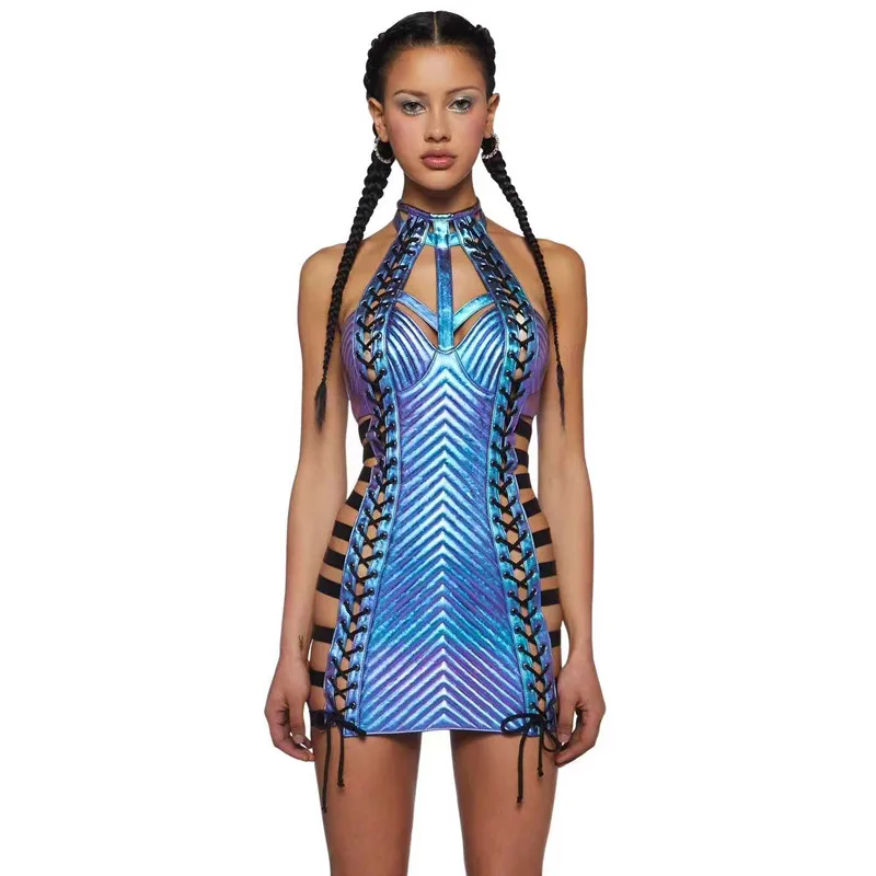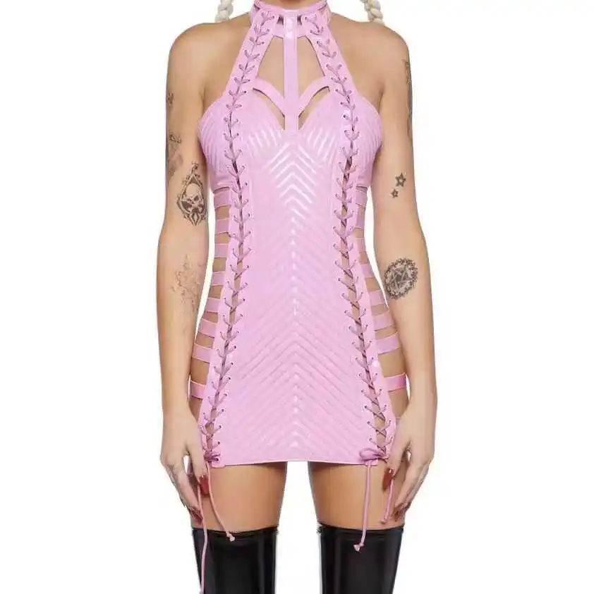 Женское короткое кожаное платье, розовое, черное платье в готическом стиле с вырезами и лямкой на шее, костюм для выступлений, концертов, певиц, выступлений