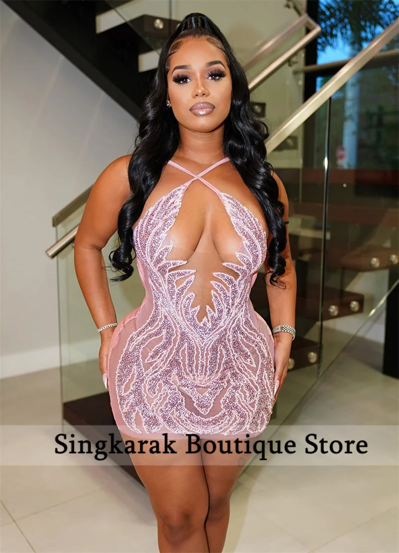Женское короткое платье для выпускного вечера, розовое платье с лямкой на шее, украшенное бисером и блестками, модель на день рождения