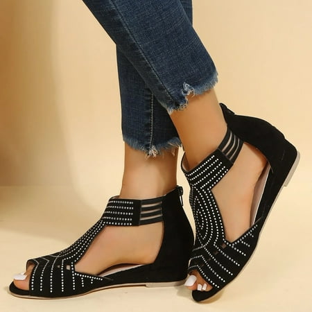 FZM Women shoes Women Rhinestone Decor Ankle Strap Sandals Open Toe Shoes Wedges Sandals Causal Shoes