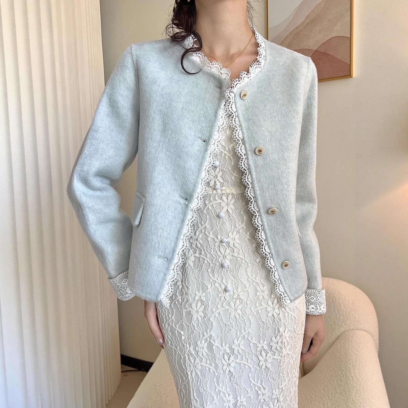 Женское короткое шерстяное пальто - Французский минималистичный стиль с кружевной отделкой пэчворк, Идеально для весны и осени S (55-63 kg) синий