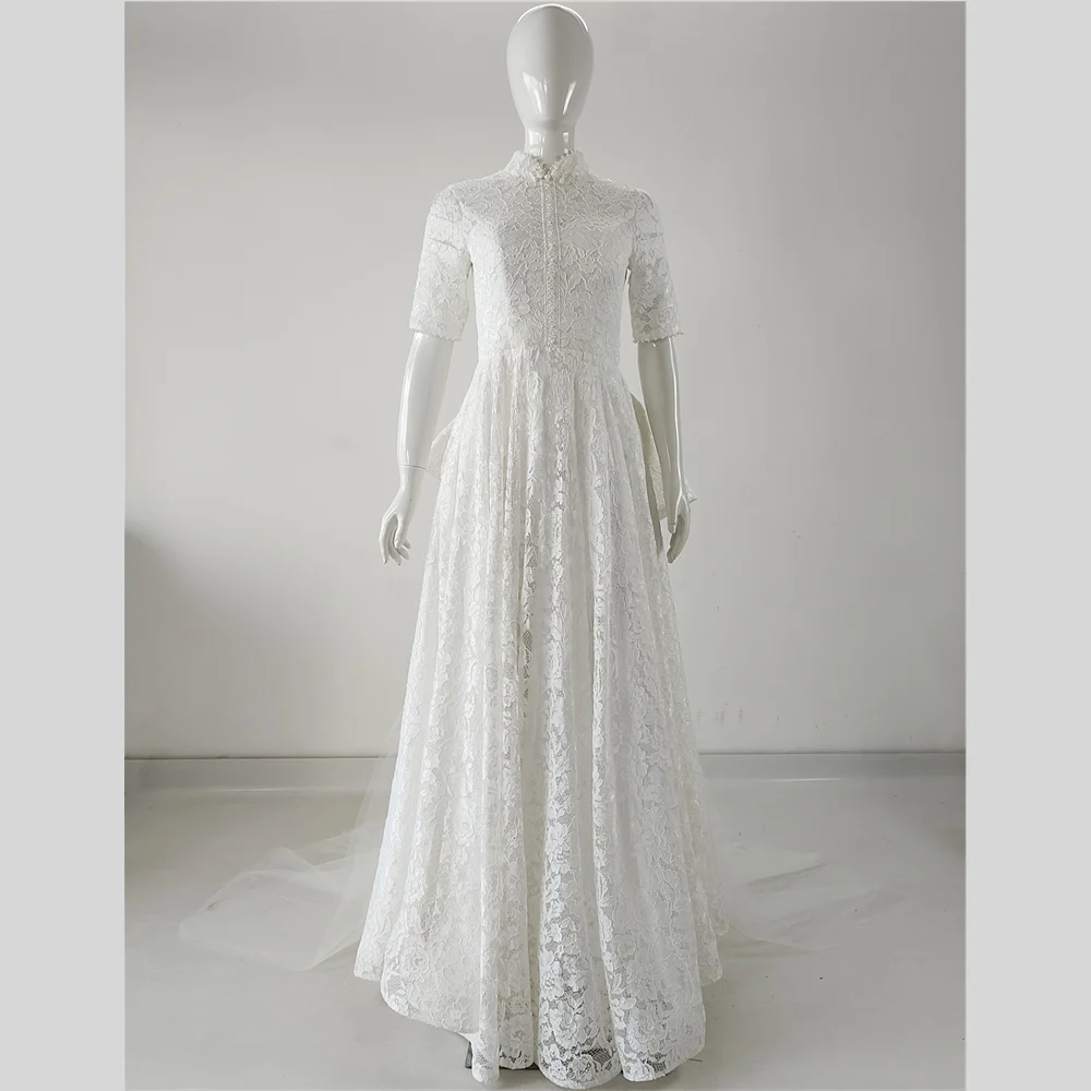 Женское кружевное платье в пол, белое ТРАПЕЦИЕВИДНОЕ ПЛАТЬЕ с высоким воротником и рукавом до локтя, модель B2837 большого размера