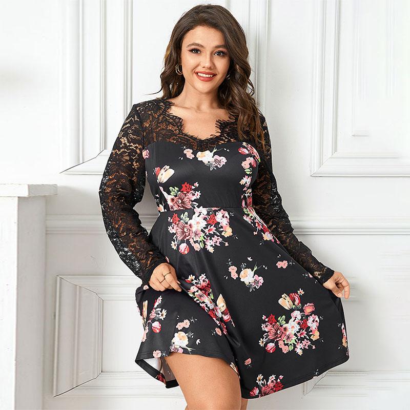 Женское кружевное платье миди с длинным рукавом и цветочным принтом в стиле пэчворк