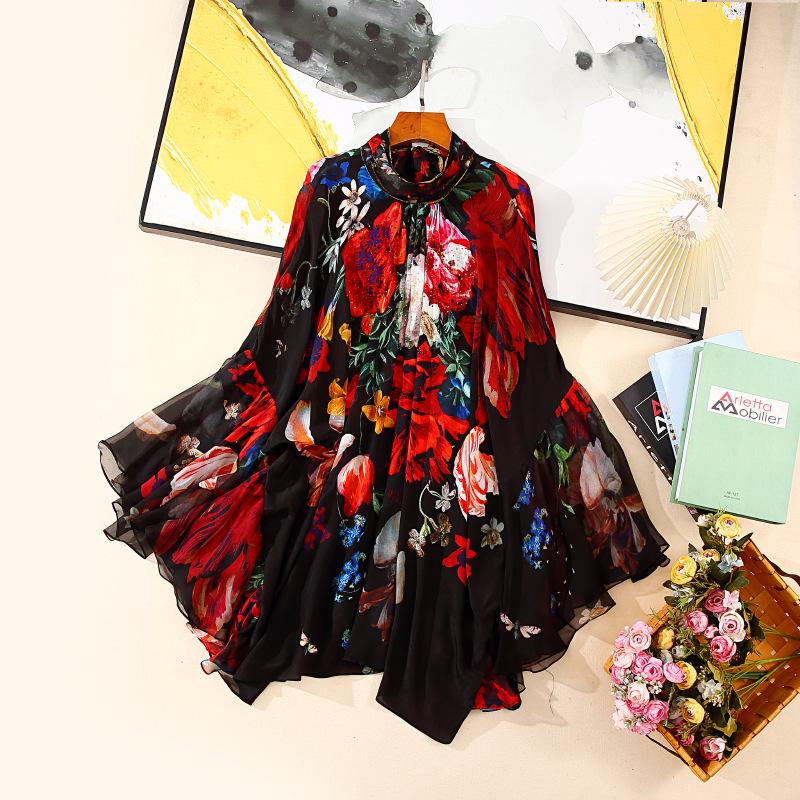 Женское курортное платье из тутового шелка с принтом камелий - Весенняя коллекция 2025 Large чёрный