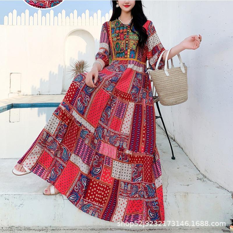 Женское летнее вышитое платье в этническом стиле, классическое туристическое платье из хлопка и шелка с цветочным принтом для пляжа One Size