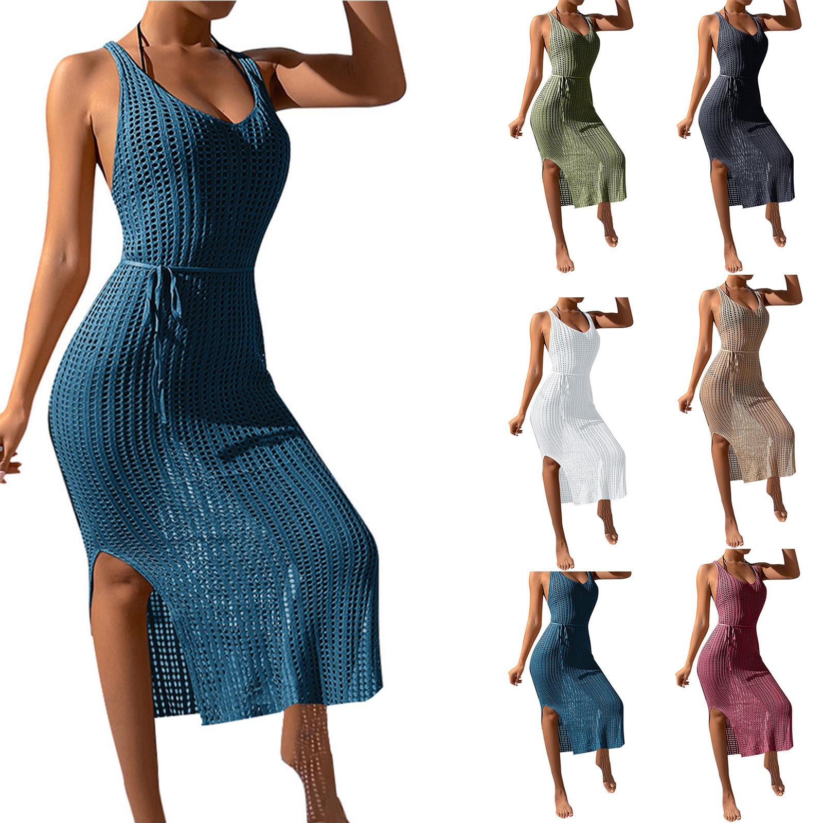 Женское летнее вязаное крючком сексуальное однотонное пляжное платье без рукавов с вырезом и разрезом на спине