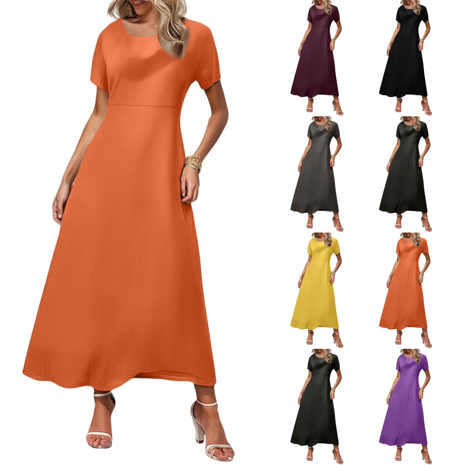 Женское летнее модное повседневное однотонное платье с короткими рукавами и круглым вырезом, свободное платье из хлопка и льна S чёрный