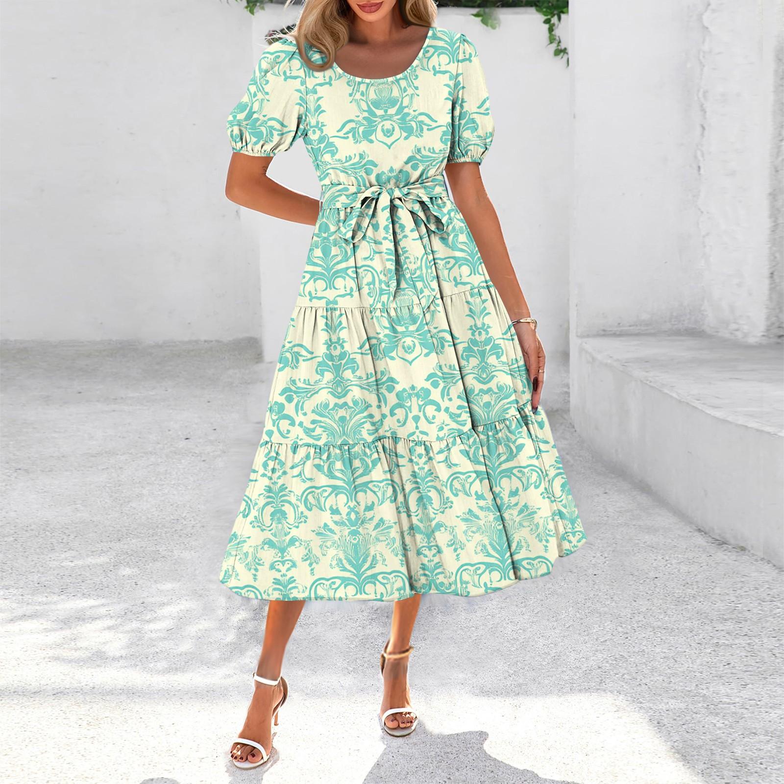 Женское летнее платье макси с коротким рукавом, круглым вырезом, поясом и карманами в стиле бохо с струящейся отделкой M