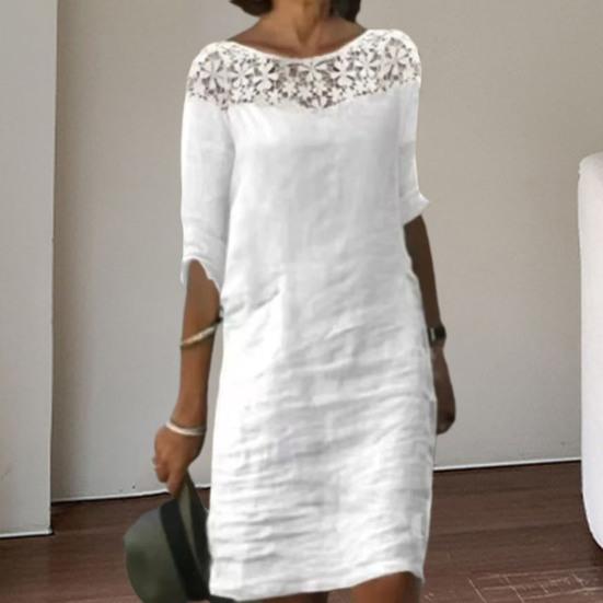 Женское летнее платье с цветочной аппликацией и половиной рукава с круглым вырезом сплошного цвета до колена