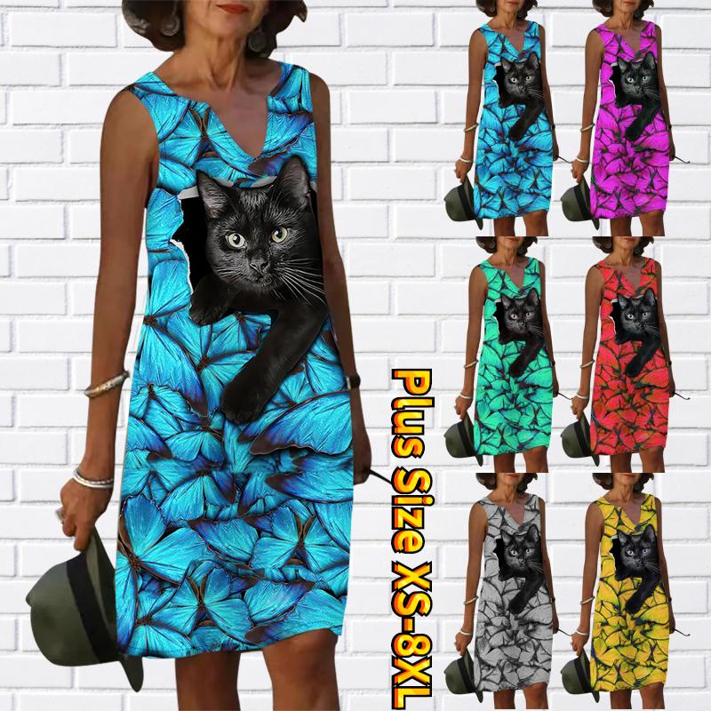 Женское летнее платье с V-образным вырезом «Маленький кот в синем цветочном принте», повседневное модное платье без рукавов, повседневные свободные сексуальные платья размера плюс XS-8XL