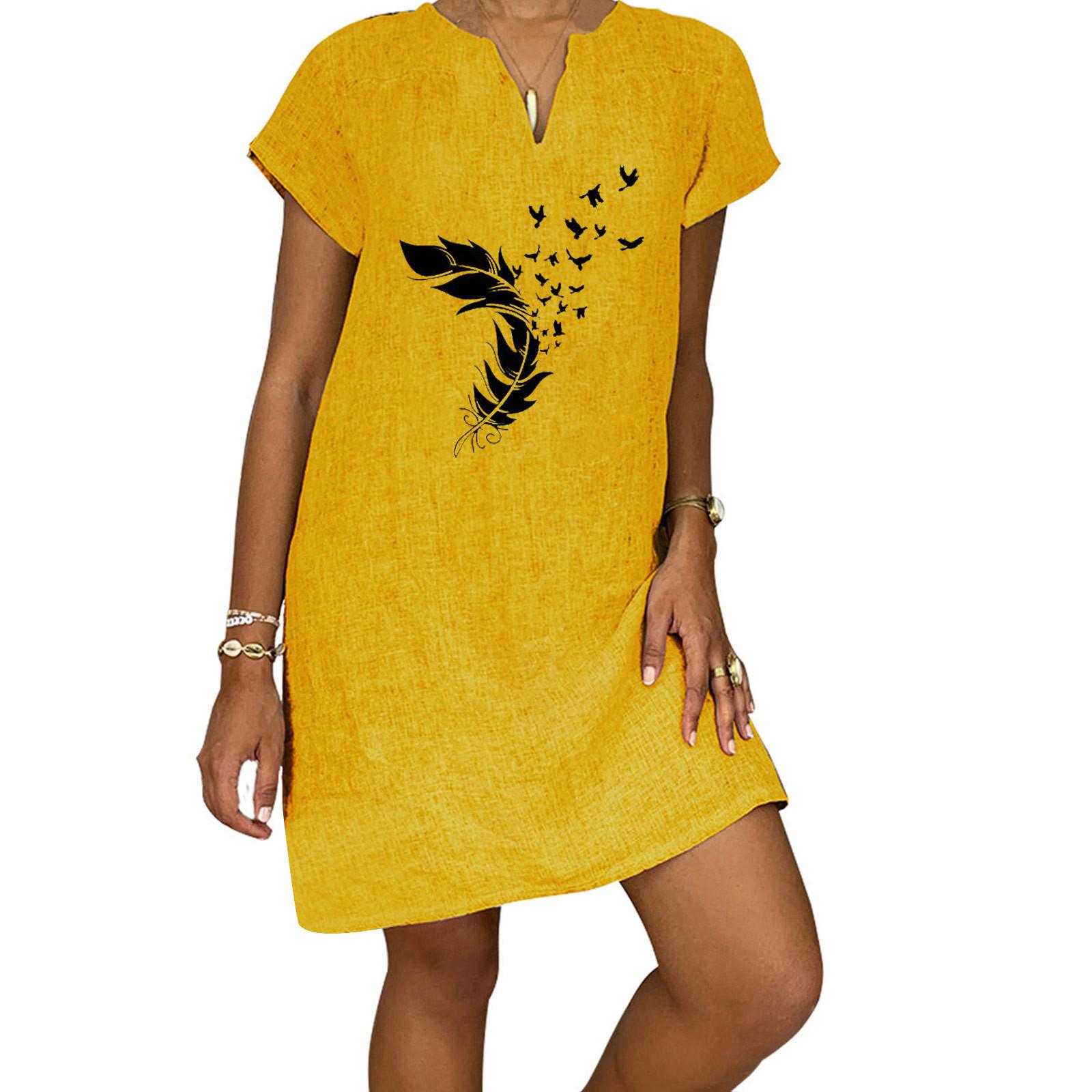 Женское летнее повседневное модное свободное хлопковое льняное платье с короткими рукавами и v-образным вырезом XXXL жёлтый