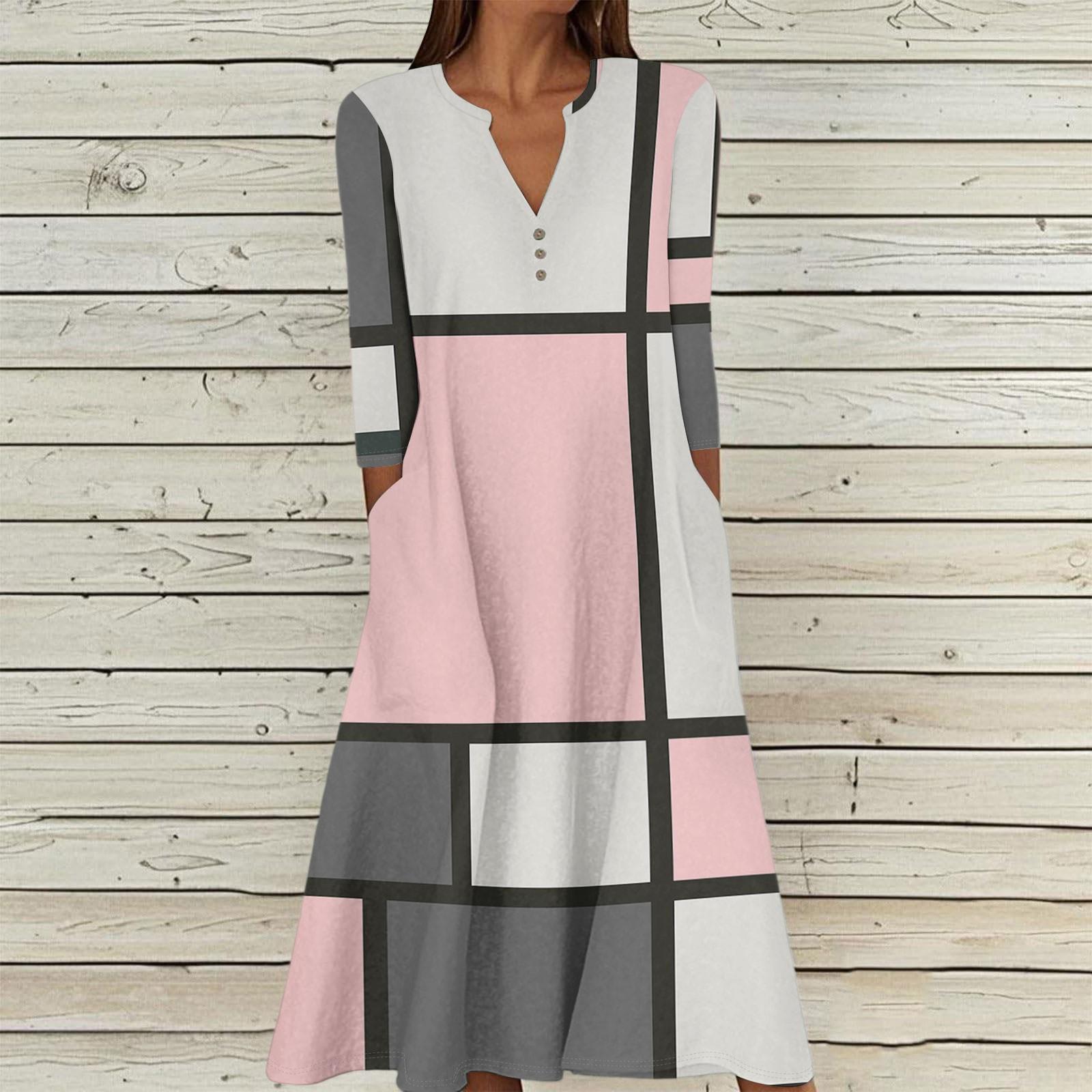 Женское летнее повседневное платье с V-образным вырезом на пуговицах, в стиле ретро, с геометрическим принтом, рукавами три четверти и карманами L розовый