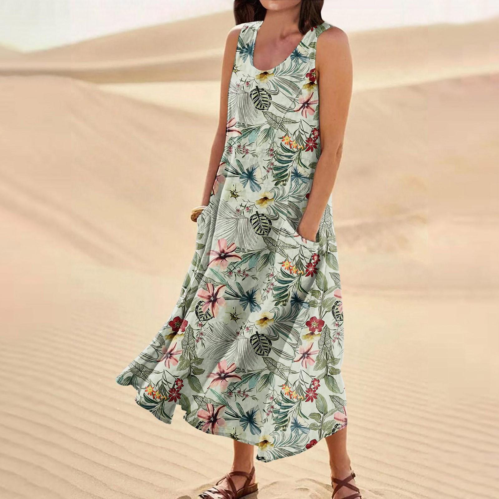 Женское летнее свободное свободное платье с круглым вырезом и цветочным принтом без рукавов, большое свободное платье с карманами XL зелёный