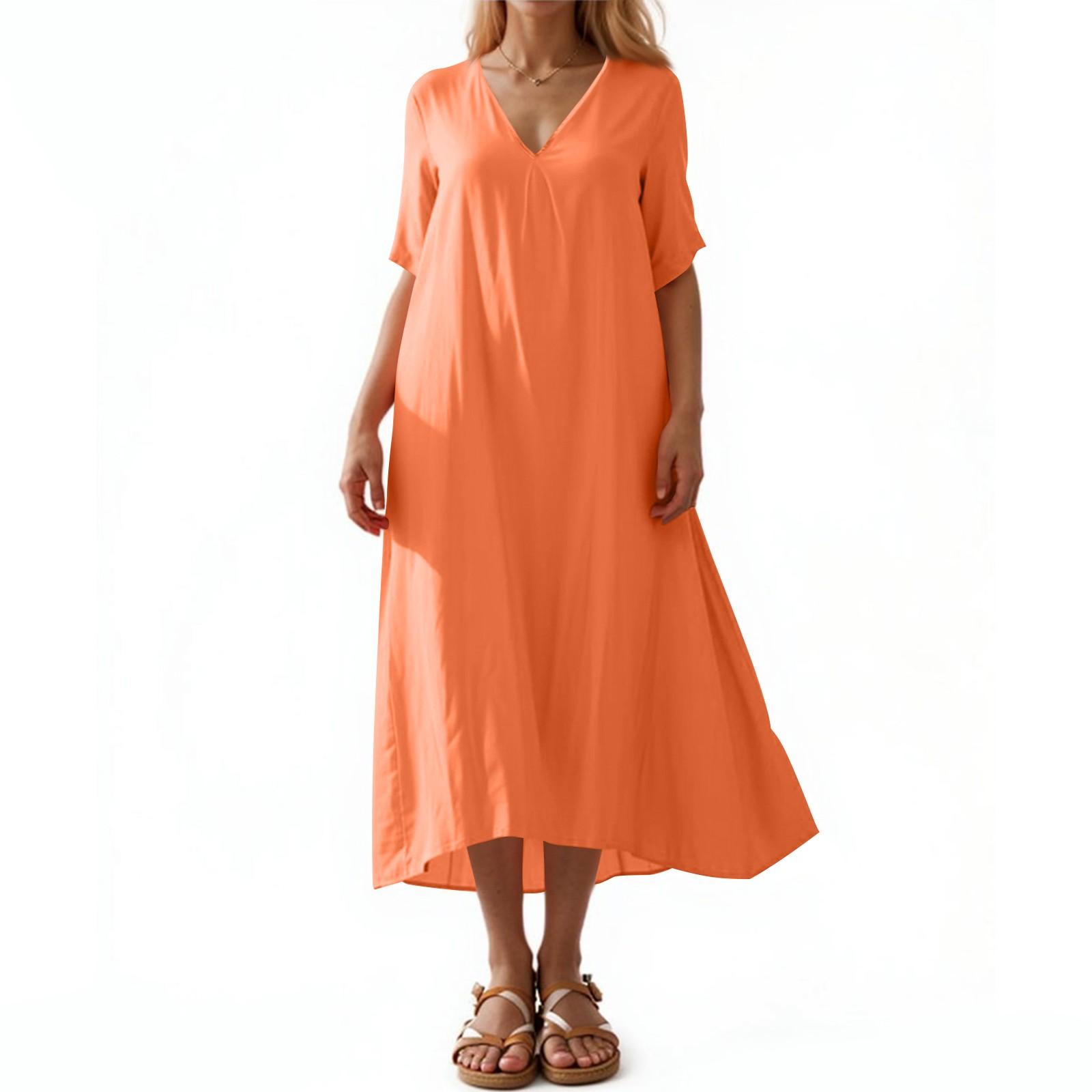 Женское летнее сплошное цветное повседневное модное платье миди из хлопка и льна с v-образным вырезом M шафрановый