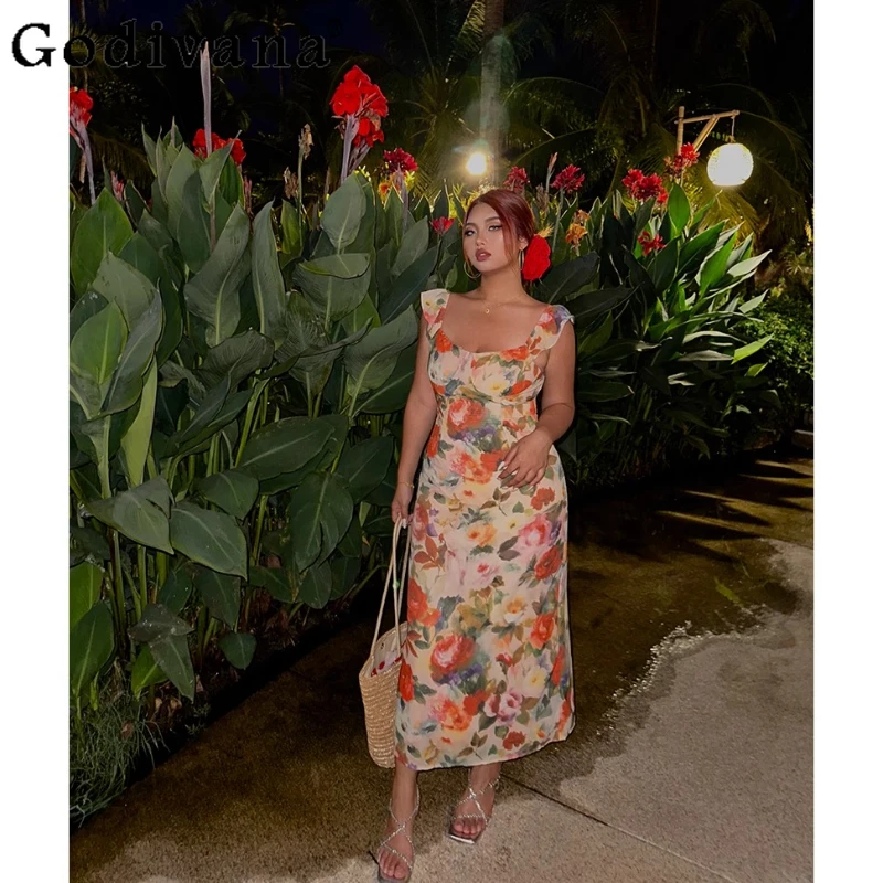 Женское летнее тонкое платье большого размера в стиле ретро с цветочным принтом для отдыха на море, темпераментное уличное длинное платье трапециевидной формы с высокой талией и принтом