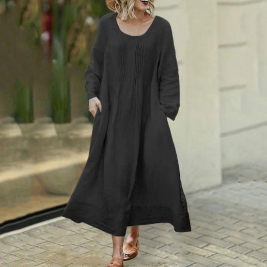 Женское макси-платье Свободное однотонное круглое вырез с длинными рукавами Карманы с длинным рукавом Линия Большой подол Мягкое дышащее плиссированное женское повседневное платье