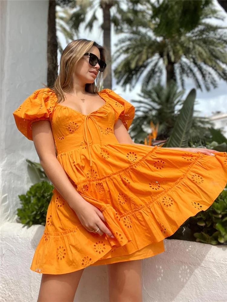 Женское милое оранжевое короткое платье с вышивкой и V-образным вырезом, лето 2022, Шикарные Женские однотонные ажурные платья, мягкое эластич...
