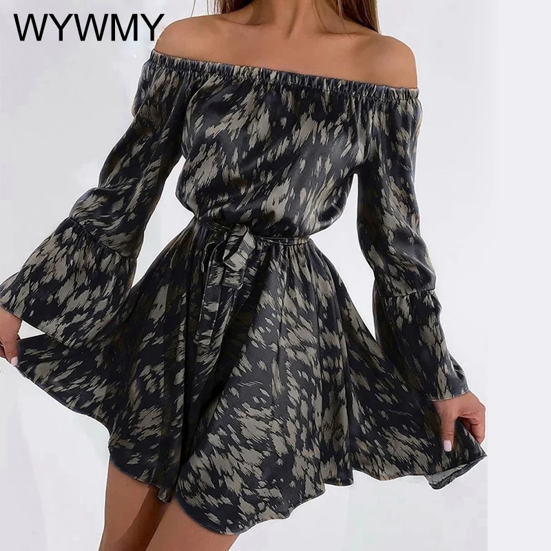 Женское мини-платье с поясом, элегантное ТРАПЕЦИЕВИДНОЕ ПЛАТЬЕ с расклешенными длинными рукавами и вырезом лодочкой, вечерние платья с отк...