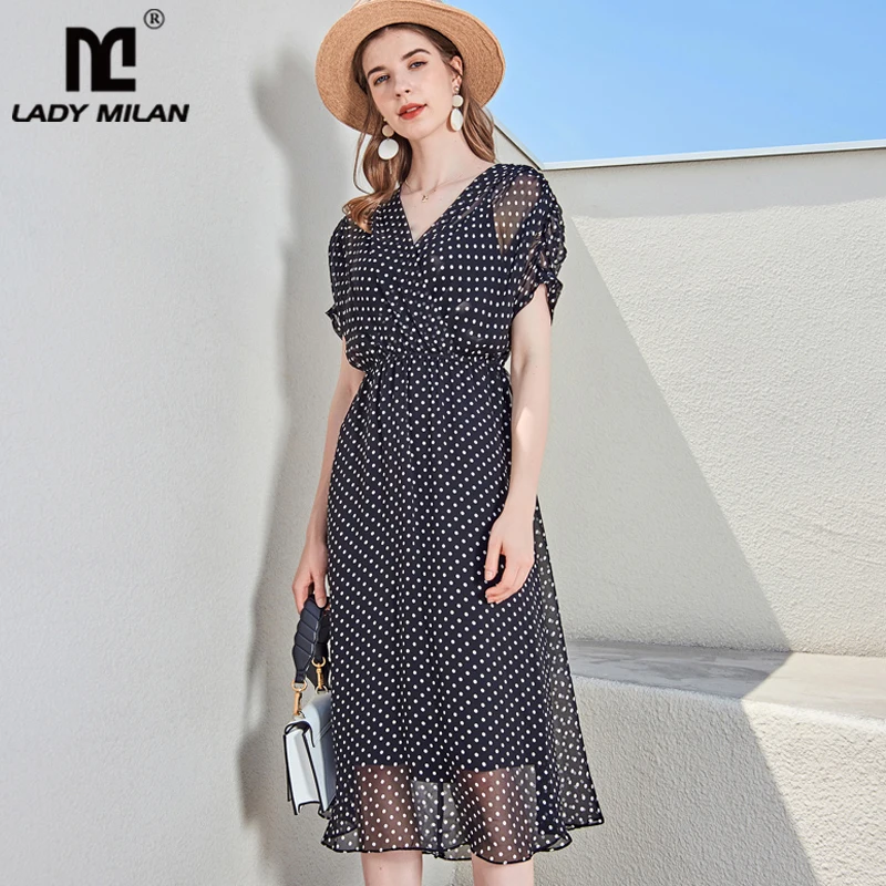 Женское модельное платье из 100% шелка, модные повседневные летние платья в горошек с v-образным вырезом, короткими рукавами и рюшами