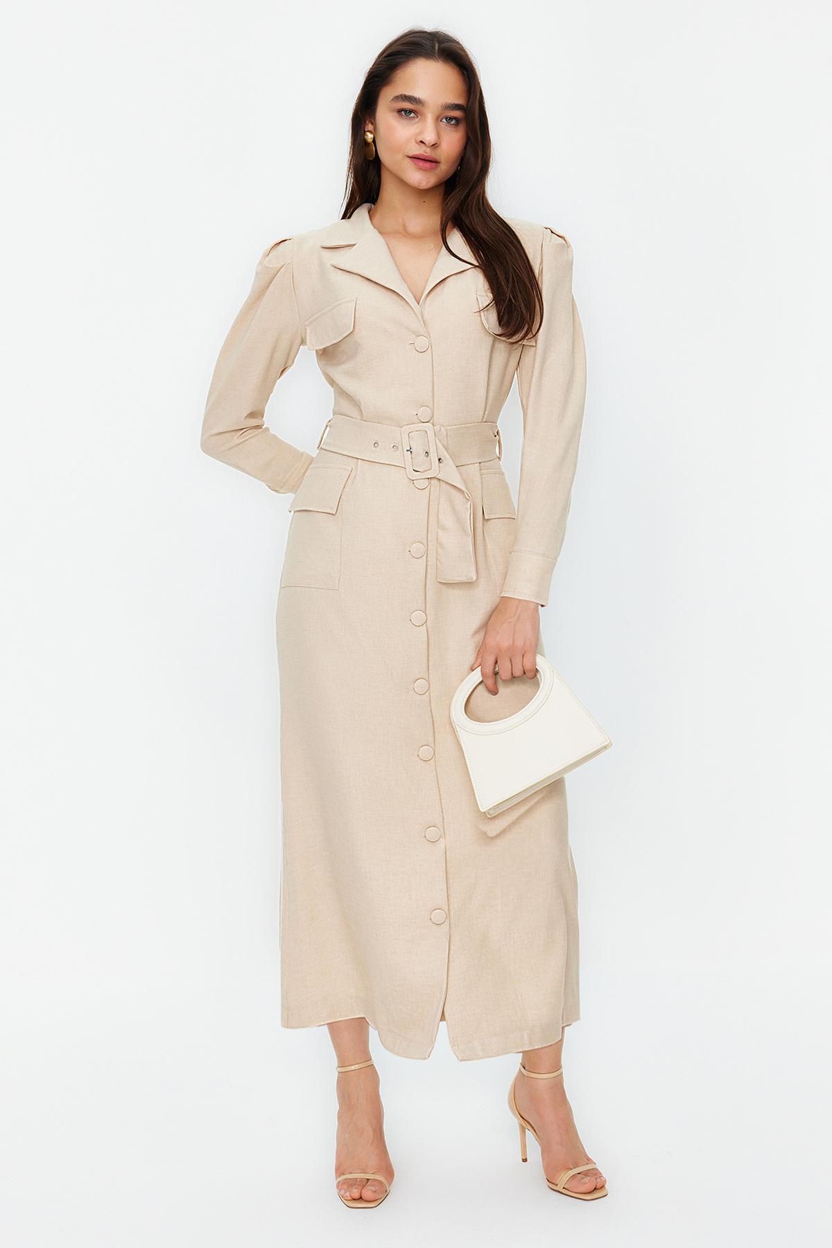Женское модное деловое тканое платье-рубашка с рукавами-фонариками и поясом макси