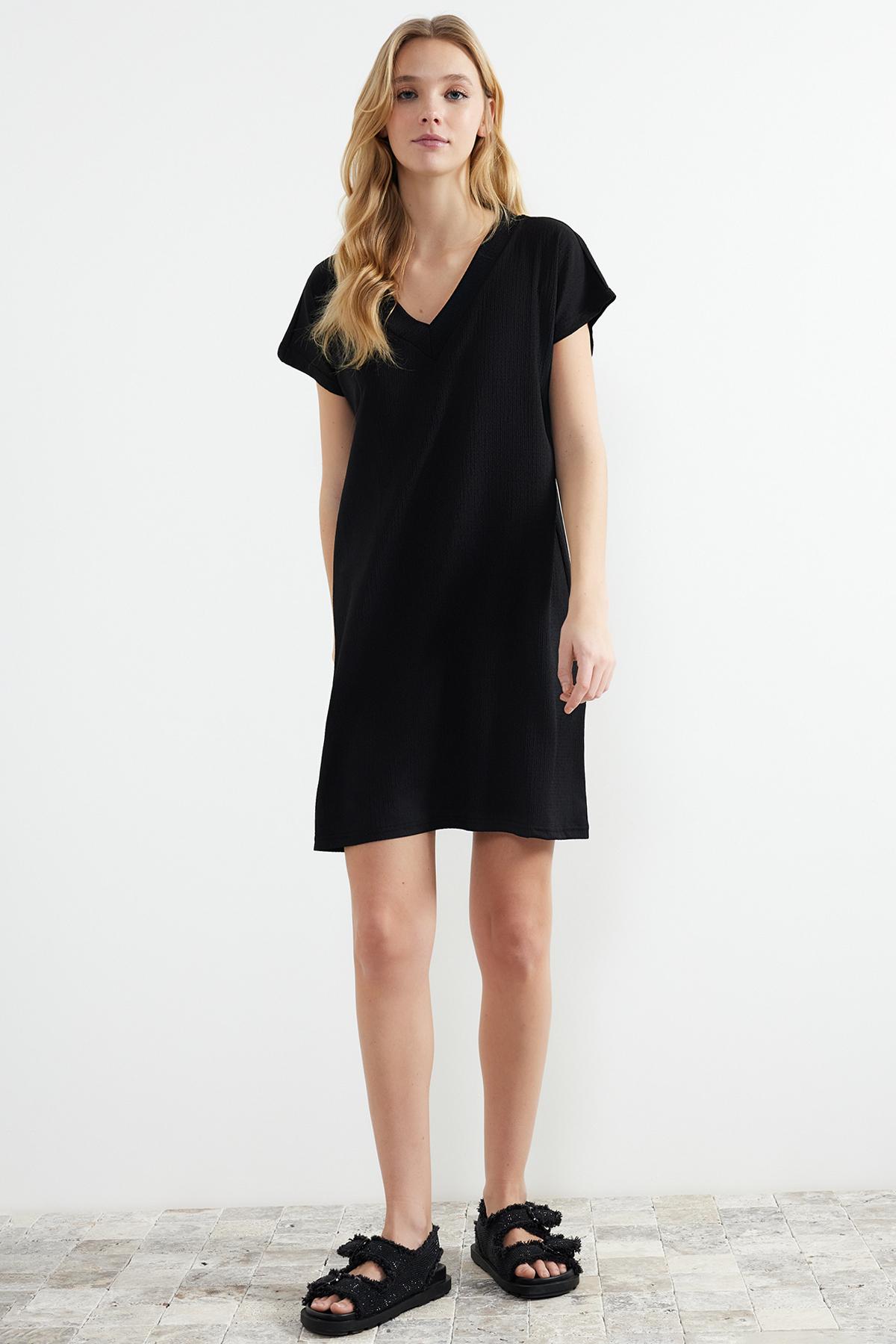 Женское модное новое платье, черное, текстурированное, с v-образным вырезом, простое трикотажное мини-платье