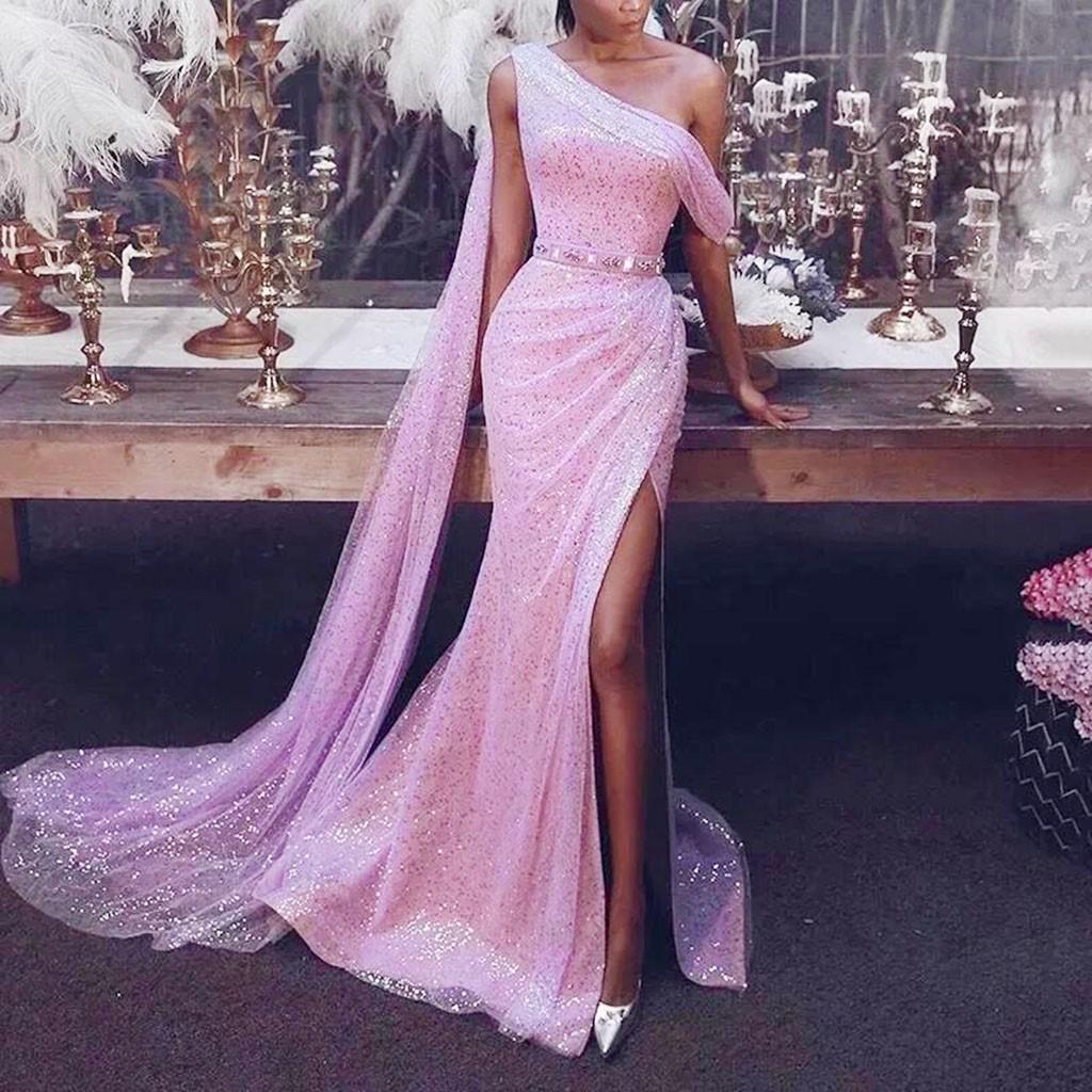 Женское модное однотонное блестящее платье с разрезом подол и вечернее платье с холодным плечевым ремнем