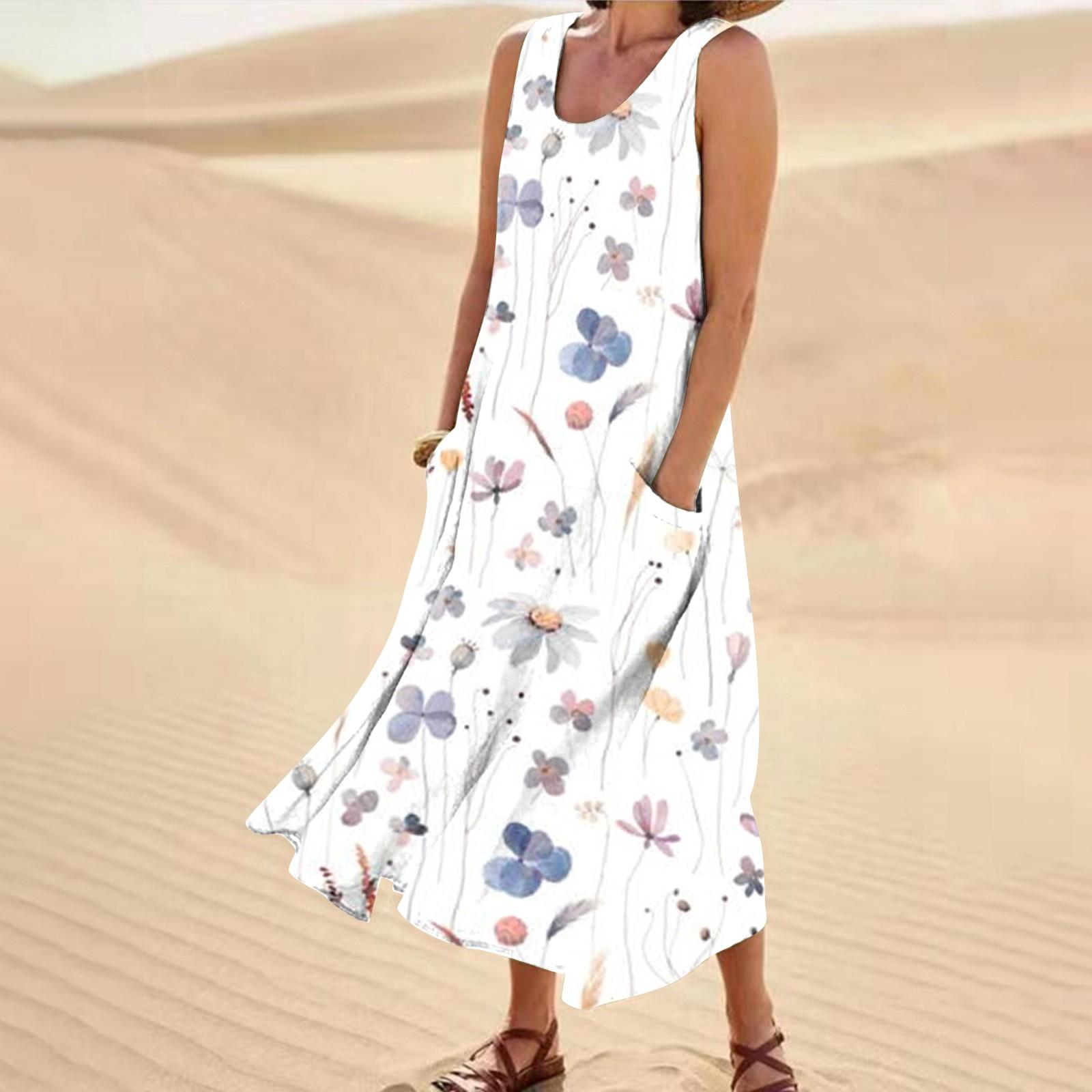 Женское модное повседневное однотонное хлопковое льняное платье без рукавов с карманами XL белый