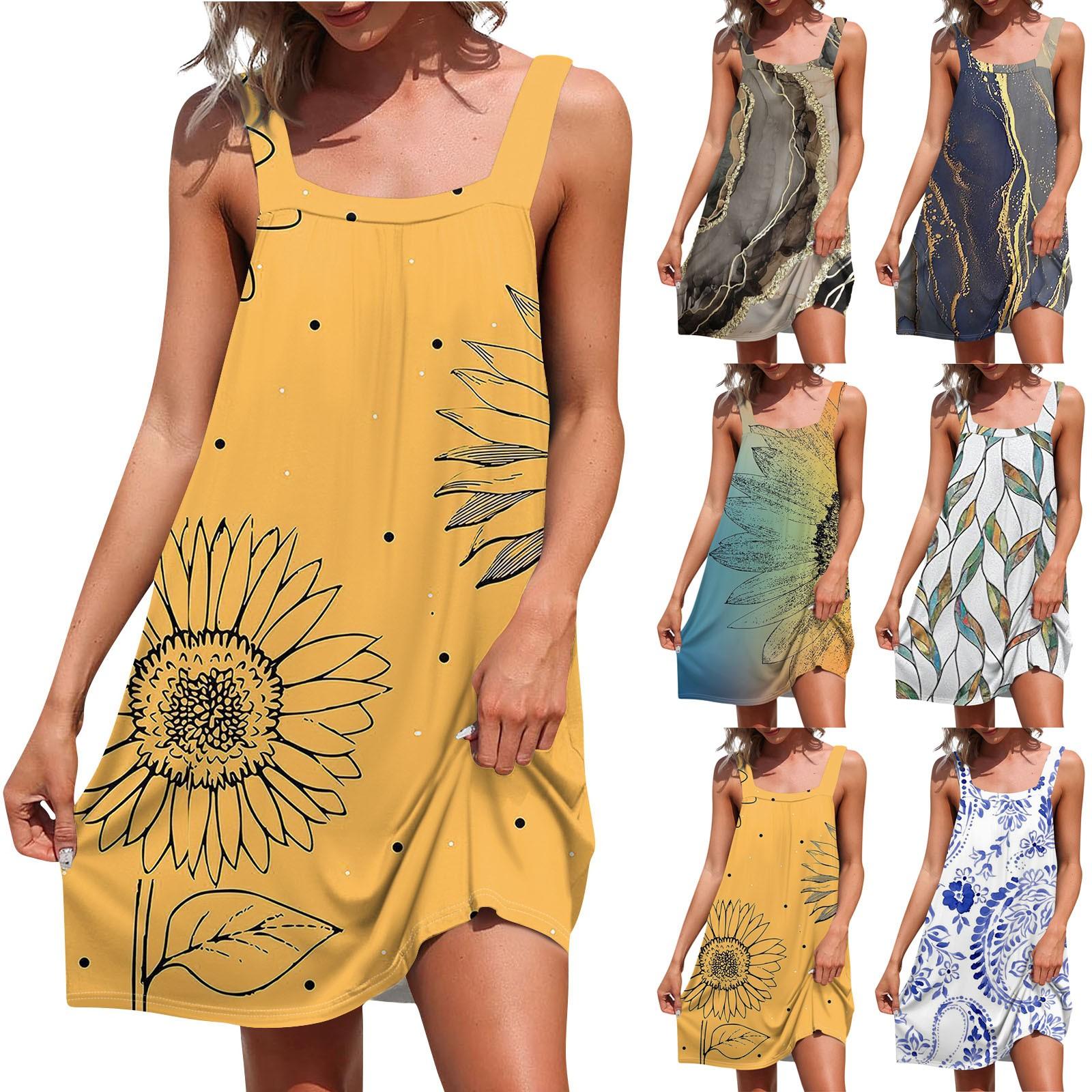 Женское модное повседневное пляжное платье без рукавов с принтом и карманами L синий