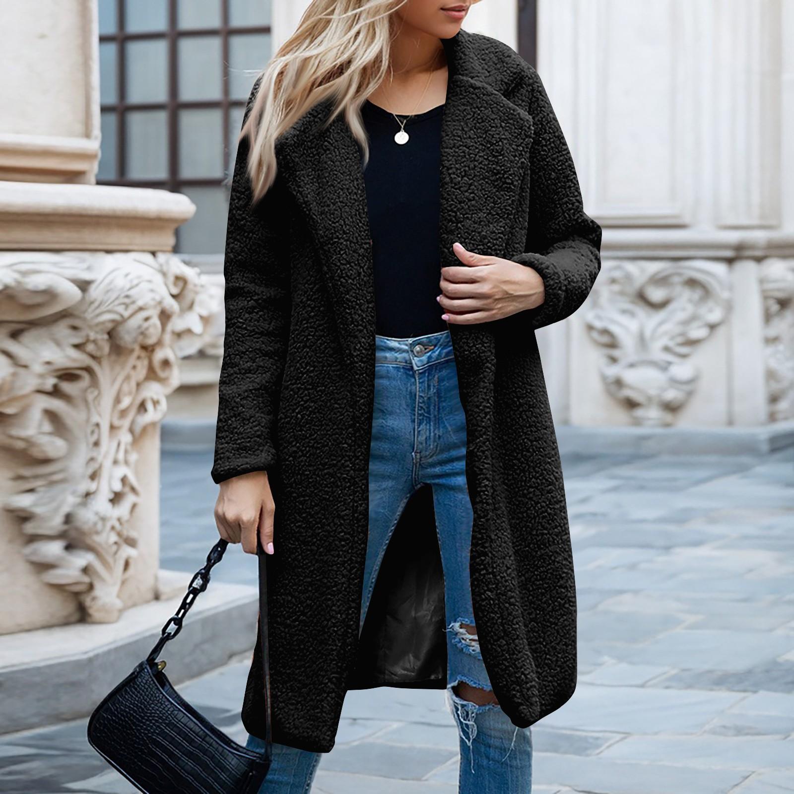 Женское модное повседневное универсальное плюшевое пальто с лацканами, однотонное пальто с длинными рукавами XL чёрный
