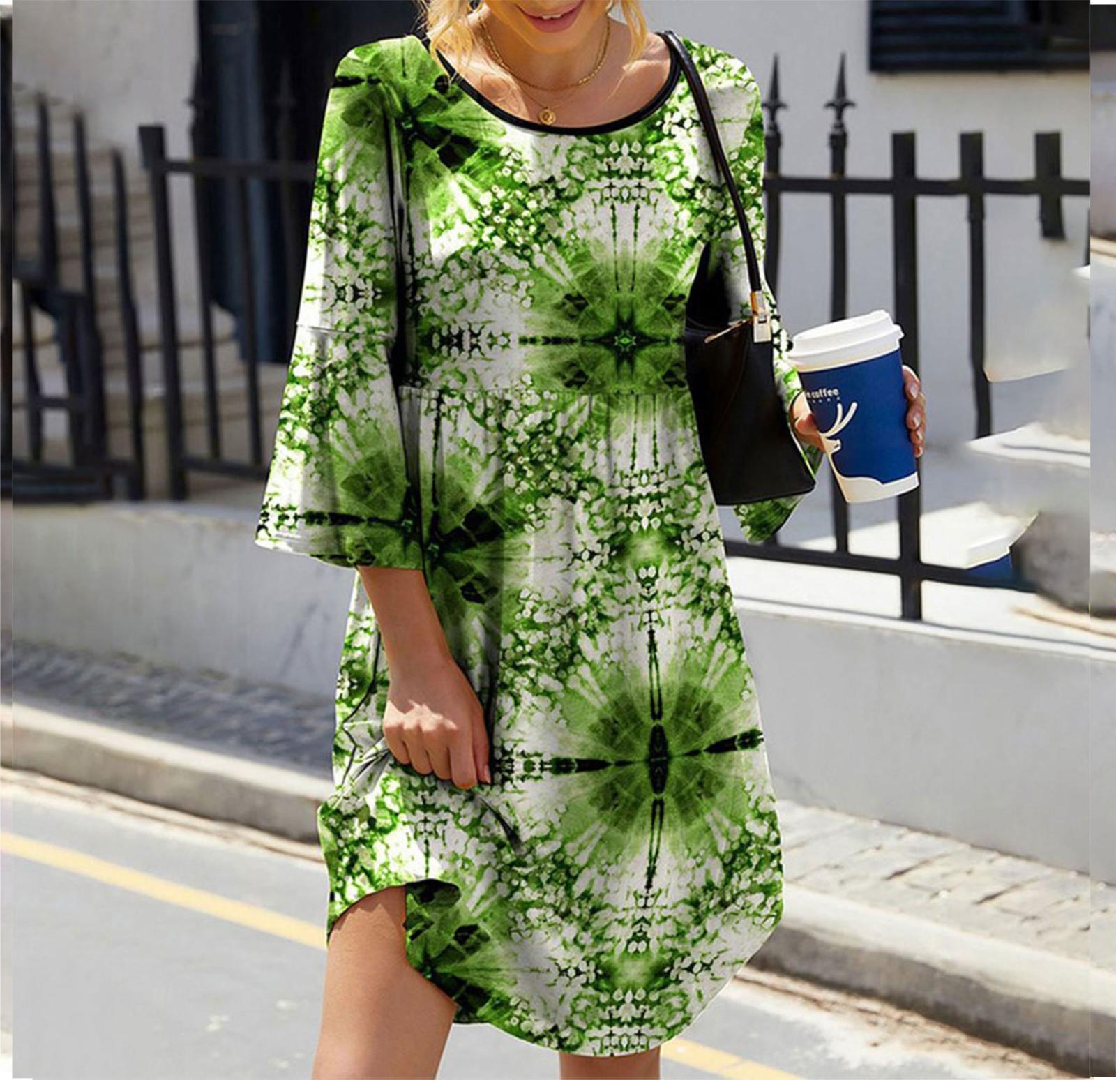 Женское модное повседневное элегантное платье средней длины с цветочным принтом и рукавом три четверти темно-зеленого