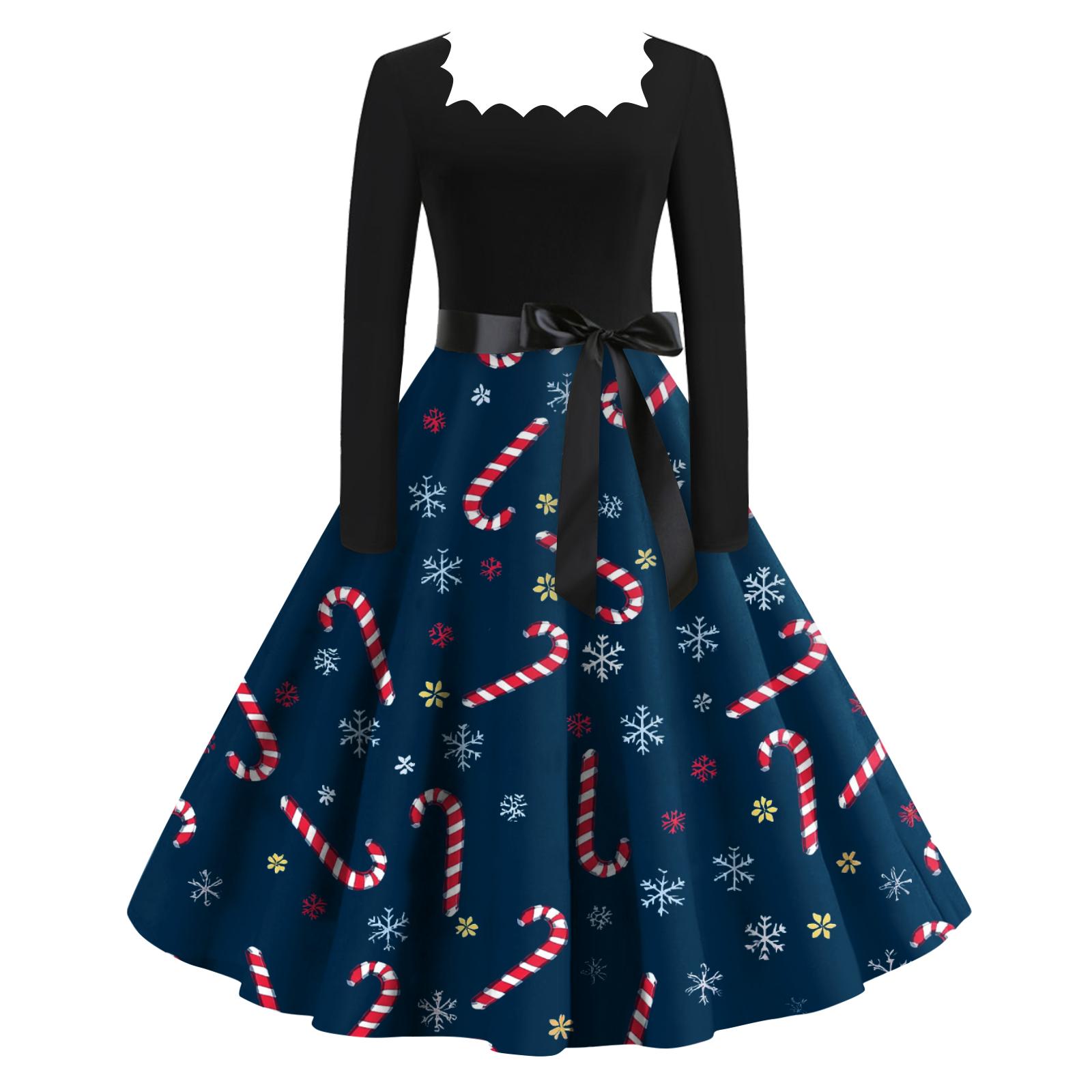 Женское модное ретро вечернее платье с длинным рукавом, квадратным вырезом и рождественским принтом XXL