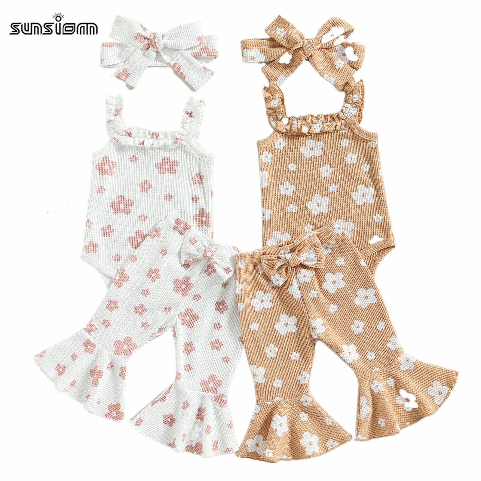 SUNSIOM Baby Girls Summer Outfit Sleeveless Floral Sling Romper + Bowknot Flared Pants/Shorts+ Headband Sets