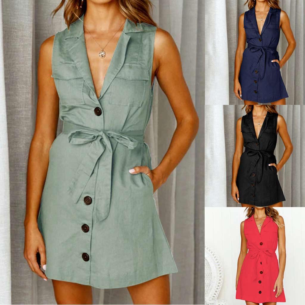 Женское модное сексуальное платье без рукавов с глубоким v-образным вырезом и пуговицами
