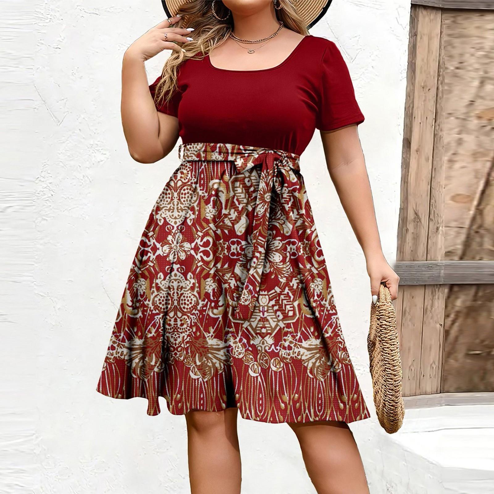 Женское модное и трендовое платье с круглым вырезом и короткими рукавами на талии с принтом размера плюс XXL