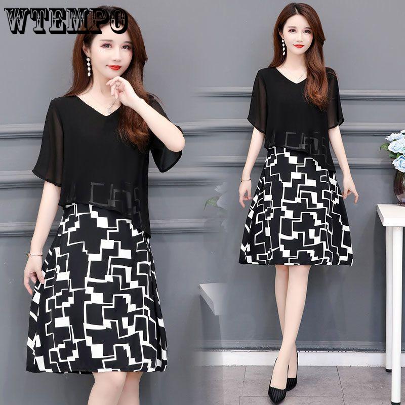 Женское модное шифоновое платье с короткими рукавами, свободные платья средней длины из двух частей с принтом L