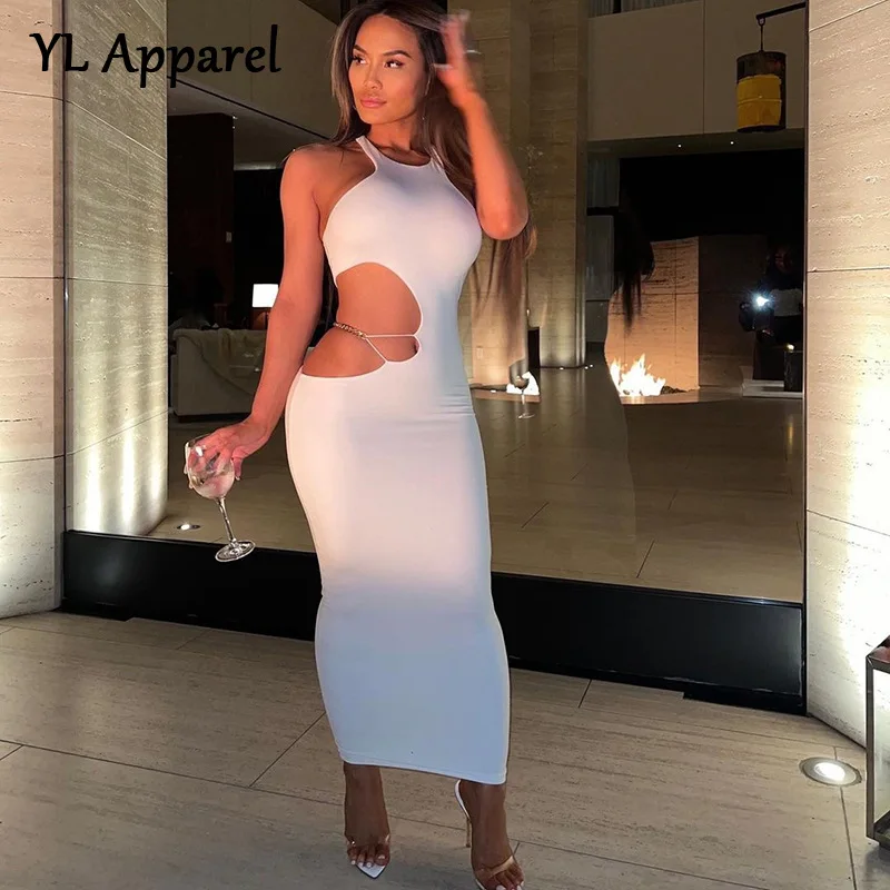 Женское облегающее платье без рукавов, однотонное черное или белое длинное платье с вырезами и открытыми плечами в уличном стиле, лето 2022