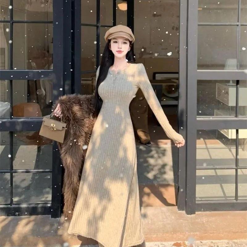 Женское облегающее трикотажное платье средней длины с V-образным вырезом - однотонное, стильная осенняя юбка Large абрикосовый