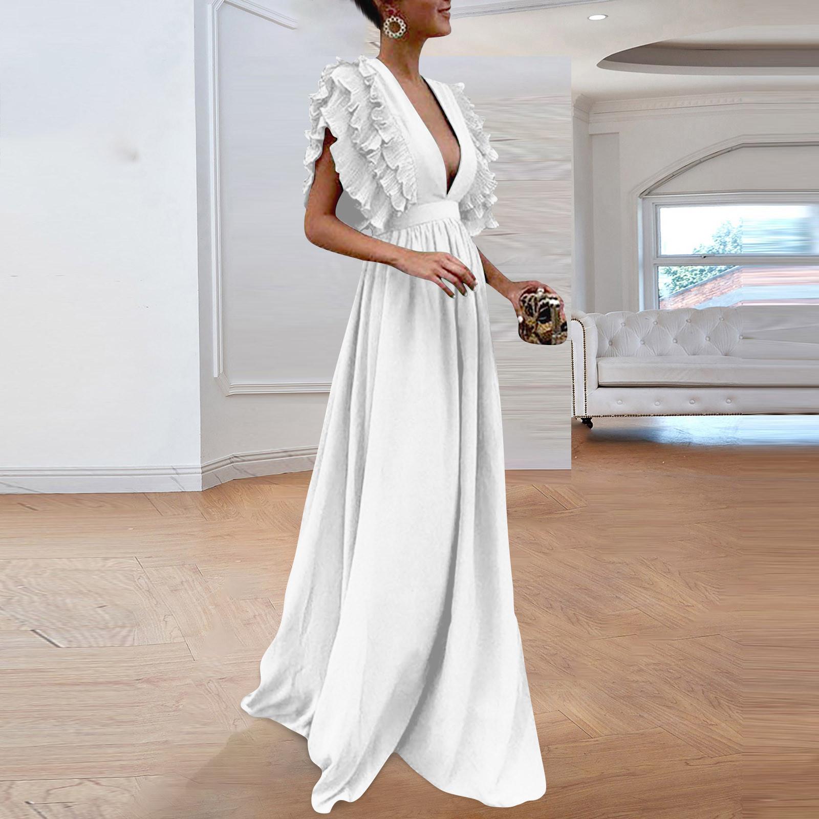 Женское однотонное винтажное длинное вечернее платье с v-образным вырезом и рукавами-крылышками больших размеров сзади XL белый