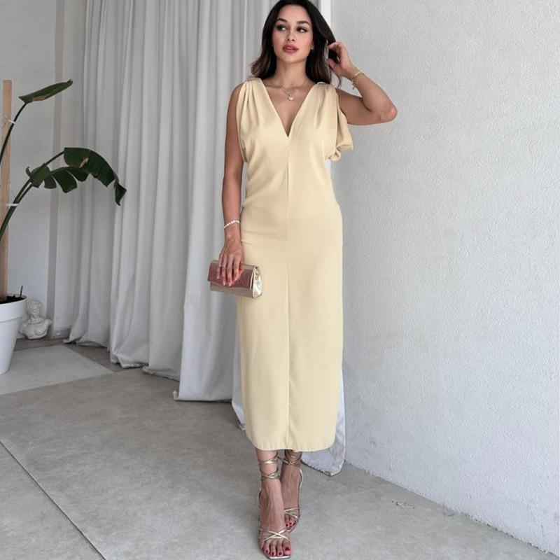 Женское однотонное платье без рукавов с V-образным вырезом, открытой спиной и разрезом, осень 2025 Extra Large