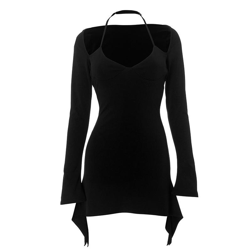 Женское однотонное платье с глубоким вырезом, длинными рукавами и открытой спиной в европейском и американском стиле на осень L чёрный