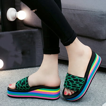 Slippers For Women Ladies Bohemian Wedges Slippers Causal Beach Shoes Leopard Print Sandals Womens Rainbow Slippers Size 9 Slippers for Women Non Slip Furry Slippers for Women Open Toe Womens Comfy
