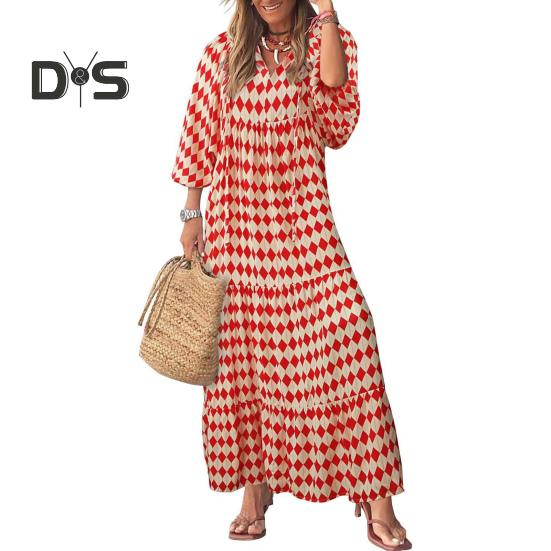 Женское осеннее платье с рукавами-фонариками, V-образным вырезом и принтом, А-силуэта, свободного покроя, длиной до щиколотки, пэчворк, бохо, пляжное макси-платье, повседневное длинное платье L красный