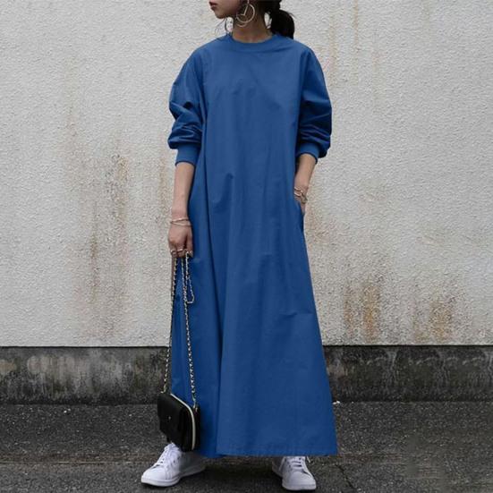 Женское осенне-весеннее платье в стиле ретро с круглым вырезом трапециевидной формы, свободное сплошное цветное платье до щиколотки с эластичными манжетами, мягкое повседневное женское платье макси с большим карманом M синий
