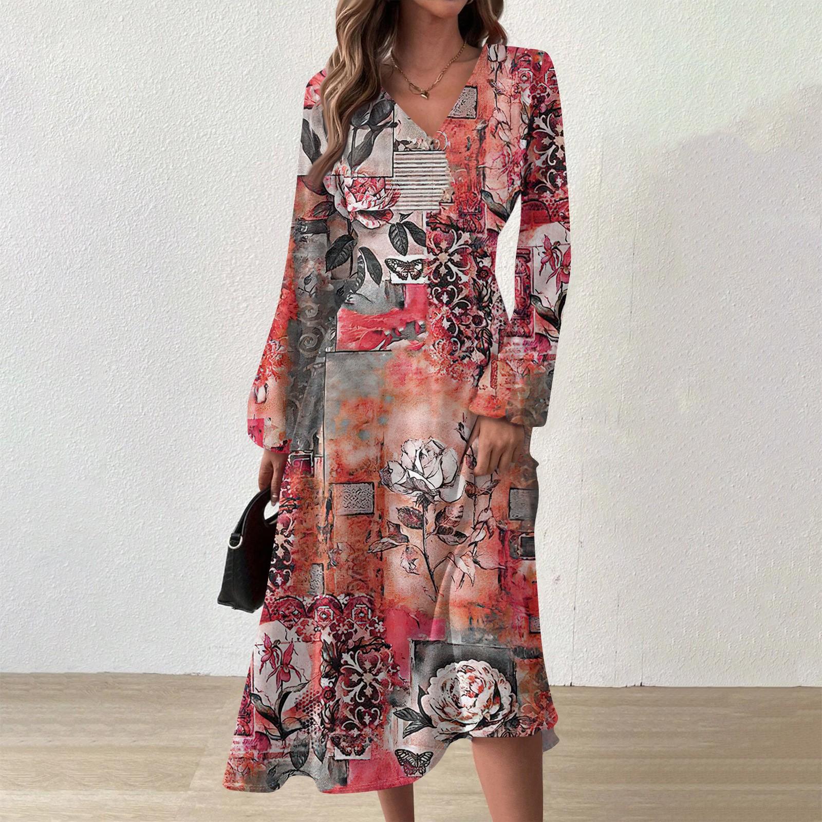 Женское осенне-зимнее повседневное модное длинное платье с v-образным вырезом и длинным рукавом с принтом XL
