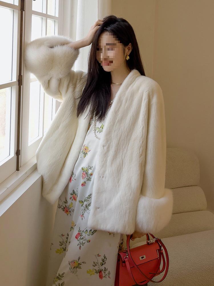Женское пальто из искусственной норки с V-образным вырезом - Корейская мода, Приталенный силуэт, Пушистая верхняя одежда Small