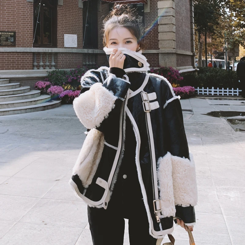 Женское пальто из овечьей шерсти, зимняя новая Толстая меховая мотоциклетная черная Свободная куртка на молнии с бархатной подкладкой, теп...