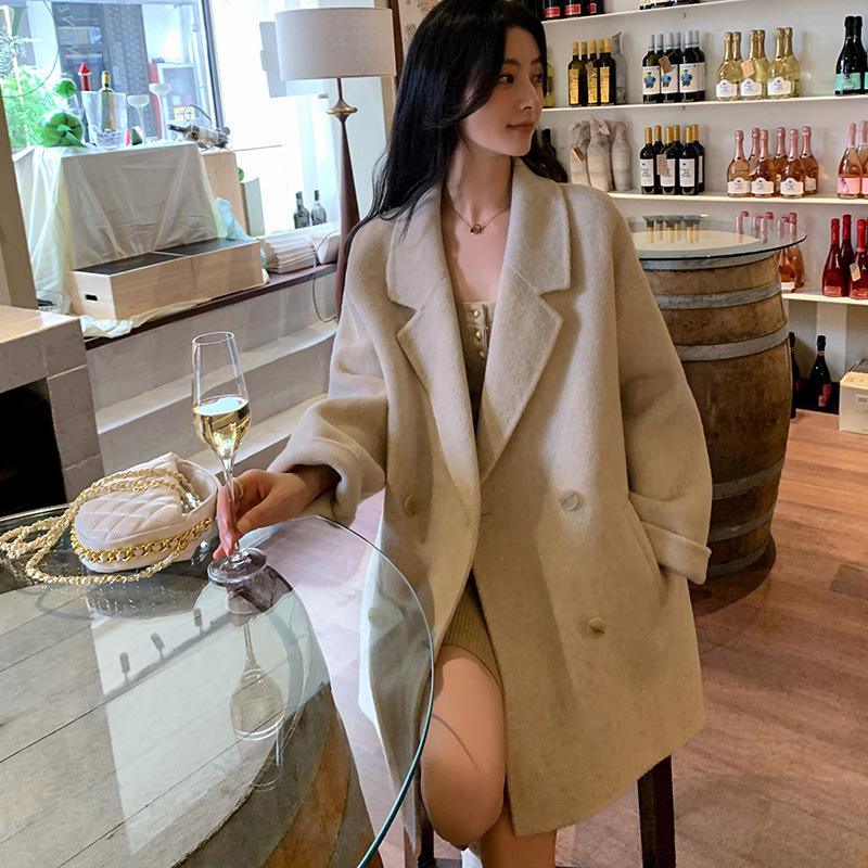 Женское пальто средней длины из шерсти альпаки двубортное - Двустороннее, воротник пиджачного типа, с поясом, коллекция осень/зима Small грязно-белый
