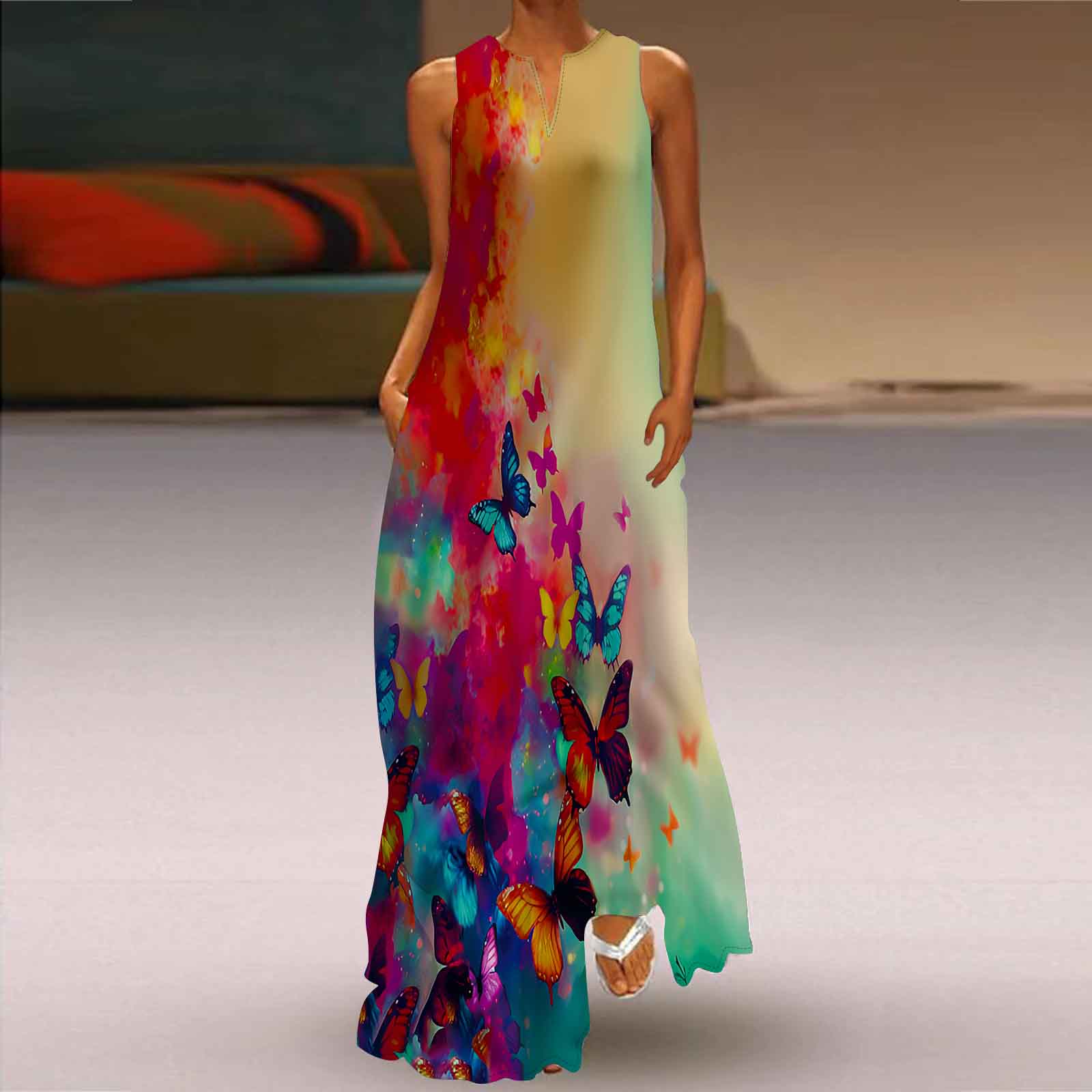 Женское платье А-силуэта Макси Длинное без рукавов Красочный ореол с принтом Осень и зима с v-образным вырезом Ретро Стиль Элегантный XS разноцветный
