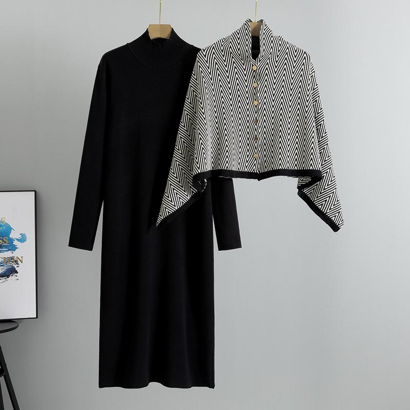 Женское платье больших размеров в стиле темперамент, осеннее трикотажное утягивающее пальто-шаль, длинное платье, костюм из двух частей one size чёрный