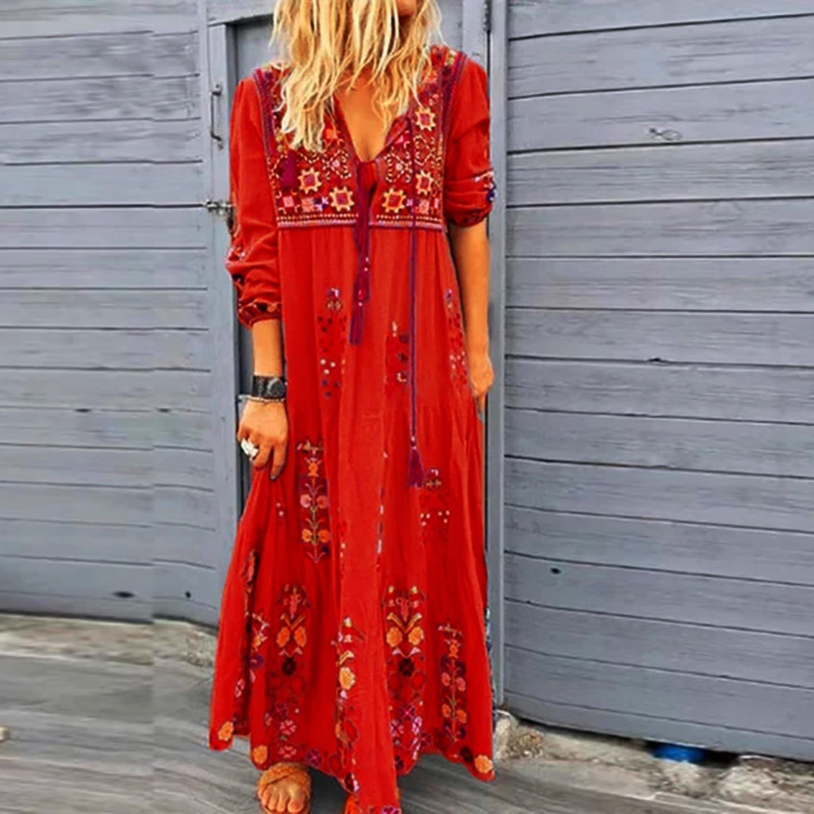 Женское платье больших размеров с V-образным вырезом и длинным рукавом в стиле бохо, вечернее платье макси XXXL красный