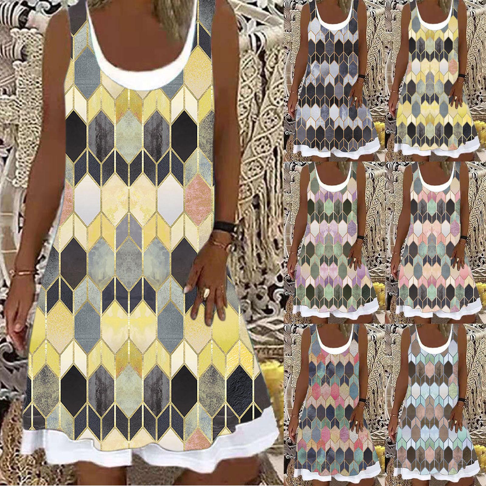 Женское платье в клетку с геометрическим принтом в стиле ретро, свободное платье без рукавов с круглым вырезом